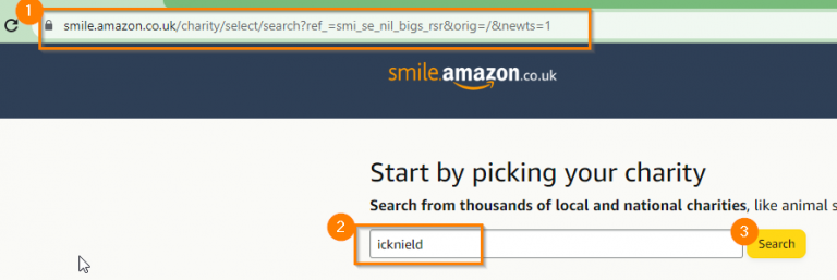 Step 1: Simply visit https://smile.amazon.co.uk./change/, click on Get started and then search for Icknield