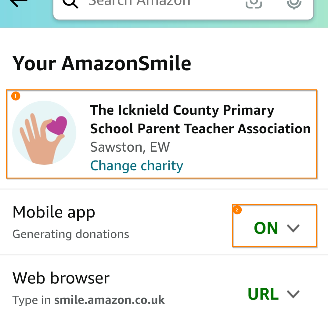 AmazonSmile will donate 0.5% of the net purchases to a charity of your choice. The Icknield PTA is a registered AmazonSmile charity. You can support us when shopping at smile.amazon.co.uk or from your Amazon App. All you would need to do is to complete a one-time simple setup process as described below.